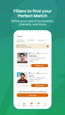 உங்கள் திருமணத்திற்கான சுயவிவரத்தை எளிதாக உருவாக்கி, கோடிக்கணக்கான பொருத்தமான துணைகளை எங்கள் தளத்தில் ஆராயுங்கள். எங்களின் சக்திவாய்ந்த MIMA™ எனப்படும் AI-இயக்கப்படும் மேட்ச்மேக்கிங் தொழில்நுட்பம், உங்கள் எதிர்பார்ப்புகளுக்கு ஏற்ற சிறந்த பரிந்துரைகளை வழங்குகிறது. புதிய பொருத்தங்கள், உங்கள் சுயவிவரத்தில் ஆர்வம் காட்டுபவர்கள் அல்லது உங்கள் விருப்பத்திற்கு பதில் அளிப்பவர்கள் என அனைத்து முக்கிய தகவல்களையும் உடனுக்குடன் மொபைல் அறிவிப்புகள் மூலம் பெறுவீர்கள். நகரம், கல்வித் தகுதி, தொழில், வசிக்கும் இடம் போன்ற மேம்பட்ட வடிகட்டிகளைப் பயன்படுத்தி, உங்கள் விருப்பப்படி துணையைத் தேடுவதற்கான முழுமையான கட்டுப்பாடு உங்களிடம் உள்ளது.
