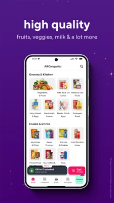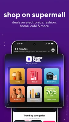 Zepto-வின் பரந்த சேகரிப்பில், புதிய பழங்கள், காய்கறிகள், பால் பொருட்கள், ரொட்டி, அரிசி, பருப்பு, எண்ணெய் போன்ற அத்தியாவசிய மளிகை பொருட்கள் முதல் பிஸ்கட், குளிர்பானங்கள், சாக்லேட்கள், தனிப்பட்ட பராமரிப்பு மற்றும் வீட்டு உபயோக பொருட்கள் வரை அனைத்தும் உள்ளன. Zepto SUPERMALL மூலம், உங்கள் ஷாப்பிங் அனுபவம் அடுத்த நிலைக்கு செல்கிறது. ஹெட்ஃபோன்கள், ஸ்மார்ட் வாட்சுகள், நவநாகரீக ஆடைகள், அழகு சாதனங்கள், வீட்டு சமையலறை உபகரணங்கள், மருந்துகள் மற்றும் செல்லப்பிராணி பொருட்கள் போன்ற அனைத்தையும் விரைவாகப் பெறுங்கள். மேலும், Zepto Café வழங்கும் சூடான காபி, தேநீர் மற்றும் சுவையான உணவு வகைகளை நொடிப்பொழுதில் உங்கள் வீட்டிற்கே வரவழைத்து மகிழலாம்.